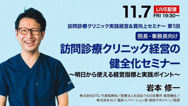 - 第1回:2025年11月7日(金)「【院長・事務長向け】訪問診療クリニック経営の健全化セミナー ~明日から使える経営指標と実践ポイント~」